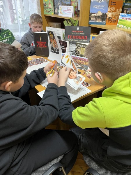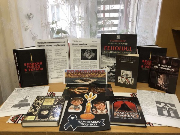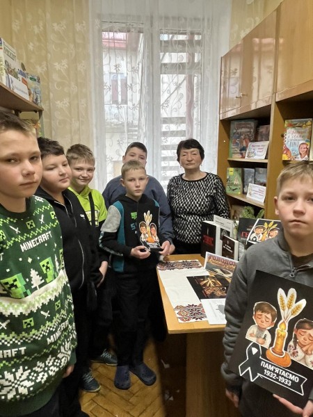 У шкільній бібліотеці представлена тематична книжкова виставка «Голодомор-геноцид українського народу». З учнями 4-А класу і класним керівником Ігнат О. В. та 6-Б класу з вчителькою музики Ненчин О.Я. була проведена година-реквієм «День пам'яті жертв Голодомору». Діти переглянули фільм, вшанували хвилиною мовчання пам'ять людей, які загинули внаслідок геноциду, виготовили аплікацію. Ми схиляємо голови перед мільйонами невинних життів, обірваних штучним голодом… Це біль, який живе у пам’яті кожного з нас. Пам’ятаймо та єднаймося у боротьбі за право українського народу жити щасливо на своїй, Богом даній землі!