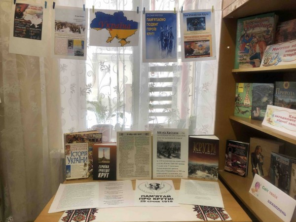 У шкільній бібліотеці вчителем історії Анатолієм Новаковським та бібліотекарем Ярославою Возною для учнів 11 класу було проведено патріотичну годину спілкування «Крути – нескорені серця». Старшокласники переглянули документальне відео, слухали розповідь вчителя історії та бібліотекаря про події того часу, знайомилися з матеріалами книжково-ілюстративної виставки «Пам’яті Героїв Крут».