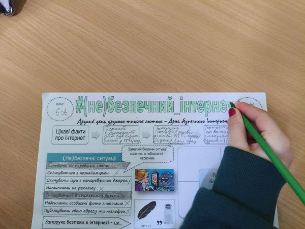 Молодші школярі працювали з тематичними картками: відповідали на запитання, розфарбовували, розгадували ребуси та виконували цікаві завдання. У такий ігровий спосіб вони вчилися правилам безпечної поведінки в мережі.